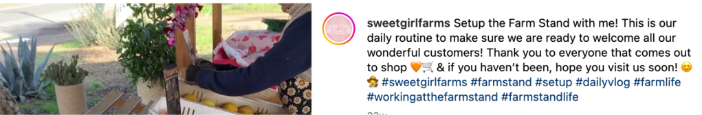9. Sell Your Story. A big mistake businesses make on Instagram is using it as an advertising platform for their products. You will not cultivate an invested and engaged audience by doing this day-in-day-out. Instagram is a powerful storytelling tool. Use it to talk about your values, the path that led you to farming, how you farm and why it’s important to you. This will pay off when your CSA enrollment opens, or when you share your farmer’s market schedule for the season.