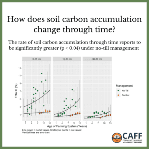 One of our primary soil health metrics of interest was total carbon, a measurement of organic and inorganic soil carbon. We reported on this metric because carbon, particularly, the organic fraction, is an important indicator of soil health. Soil organic carbon makes up approximately 58 percent of soil organic matter and affects a broad suite of soil properties and functions including aggregate stability, water holding capacity, microbial composition, and nutrient cycling. We are excited to report that total carbon was significantly greater in the no-till plots than the control (Figure 1). In addition, we saw a significantly greater rate of soil carbon accumulation in the no-till plots than the control (Figure 2).