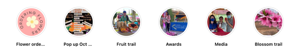 Un video corto y atractivo que puede durar hasta 60 segundos y compartirse. Los Reels pueden incluir múltiples clips de video, filtros, subtítulos, fondos interactivos, stickers y más. Efectivo para los agricultores porque puedes mostrar un resumen de tu día de cosecha o lo más destacado de tu puesto en el mercado de agricultores.