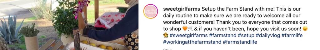 La sección de texto bajo tu nombre de usuario donde describes tu negocio en 150 caracteres o menos. A la derecha puedes ver un ejemplo de Sweet Girl Farms.