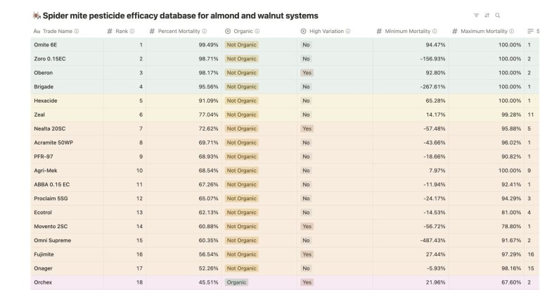 This database is derived from synthesized data of 19 different studies which assessed how pesticide type affects spider mite populations in almond and walnut systems, drawing on pesticides currently registered for