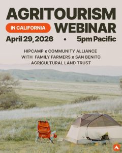 Join us for a free webinar with Hipcamp, CAFF (Community Alliance with Family Farmers), and the San Benito Agricultural Land Trust exploring California’s evolving agritourism landscape—and what it means for farmers and ranchers.