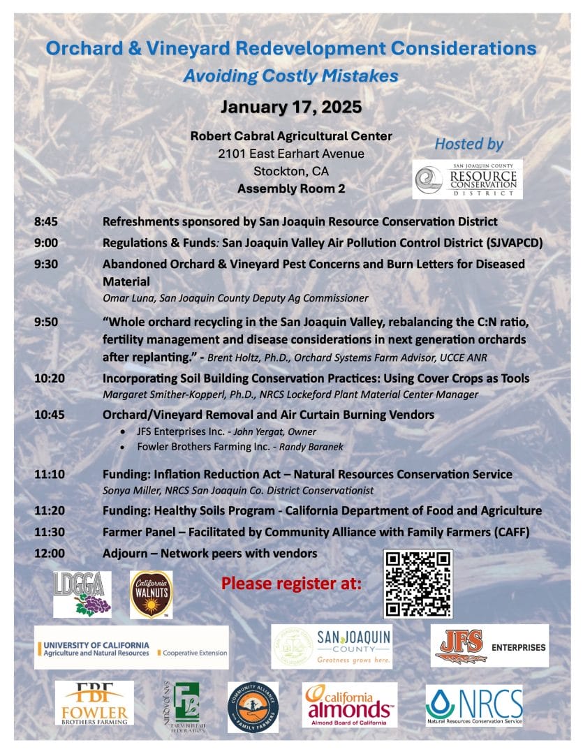Learn more about the regulations, funding opportunities, and other management practices related to removing and redeveloping orchards and vineyards at this workshop hosted by the San Joaquin Resource Conservation District.