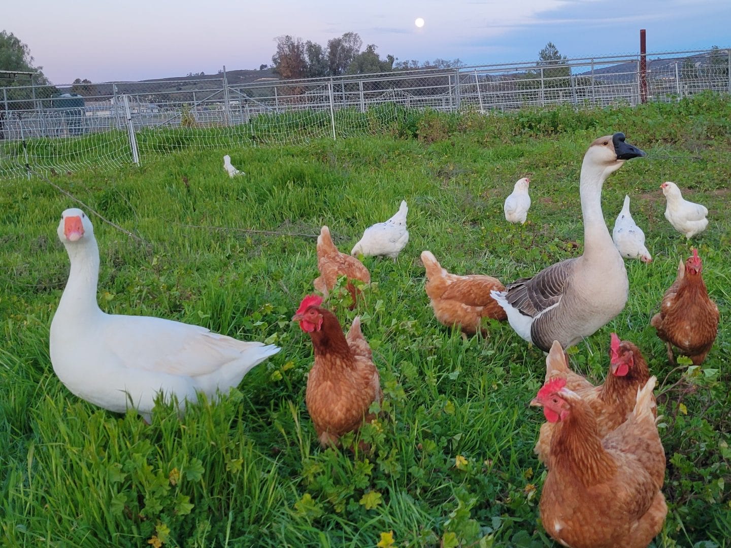 We are a small diversified farm in the foothills above San Diego. We specialize in pasture raised poultry for meat and eggs, turkeys for Thanksgiving and seasonal veggies using humane, regenerative and community focused practices.