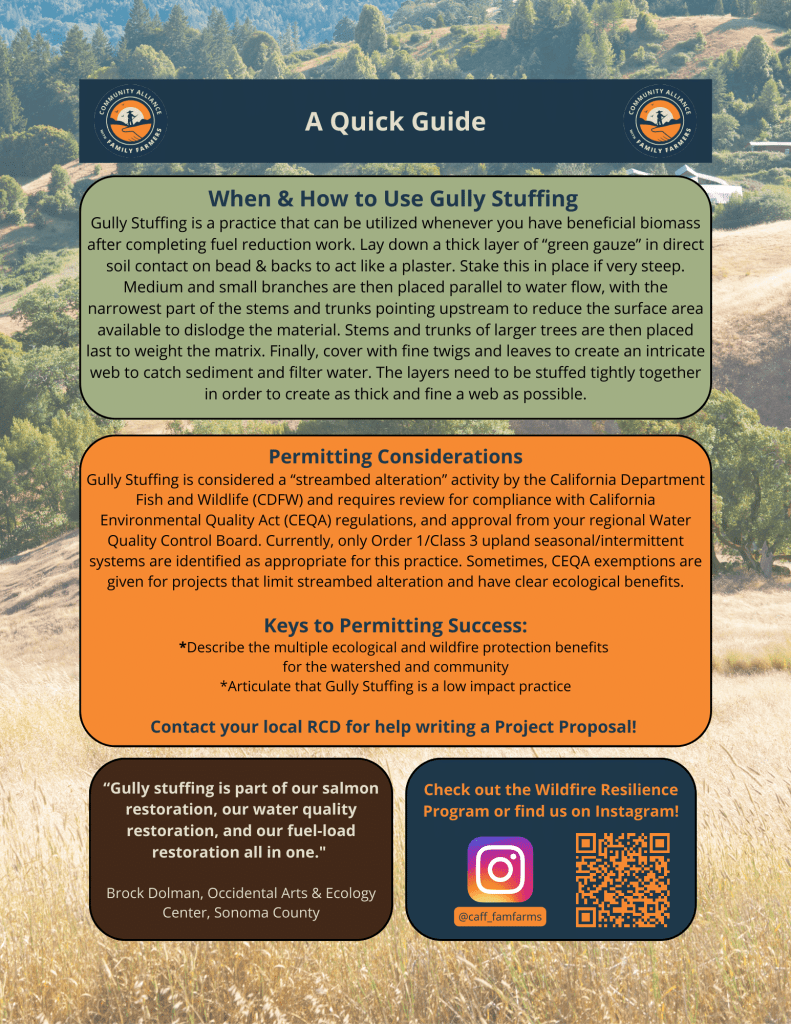 Gully stuffing can reduce water velocity, catch sediment and organic material, and stabilize the banks. This practice also raises the water table, improving resilience to wildfire.