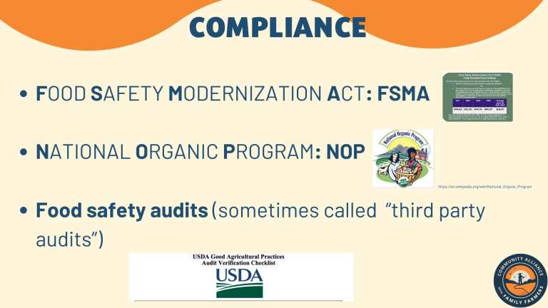 - audited by private (“third party”) entities (e.g. USDA, Primus, CCOF)