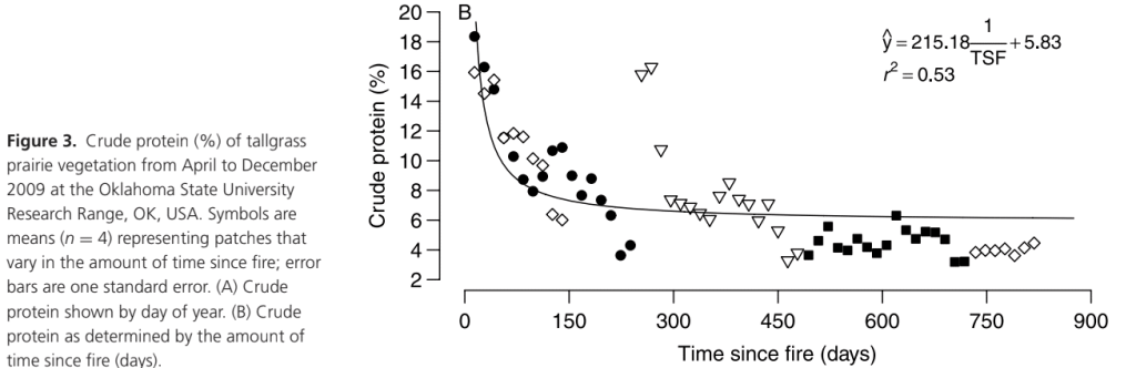 Research providing evidence for grazing animals’ preference towards recently burned grassland patches is well-established. (Allred, 2011) But can the fire-grazing interaction be strong enough to actually drive those fire regimes in the environment, not just be affected by them? “Ungulate preference for burned patches reveals strength of fire–grazing interaction”, a paper on research conducted in Oklahoma, set out to test this. They found a strong grazing preference for recently burned patches in both bison and cattle. Over the course of four years, the researchers burned the whole unit, one quarter each year. The animals’ were allowed access to the entire unit, and their movements were monitored. For bison, it was actually the strongest determinant of where the animals would graze, greater than proximity to water, shade, or slope. Cattle showed the strongest preference for grazing in proximity to shaded areas, but preference for recently burned patches was a close second. Forage quality, measured by crude protein levels of the vegetation in the patches, was highest (double than that of other areas) in the most recently burned areas. Forage quantity increased as the time since burn increased creating a tradeoff relationship between forage quality and quantity.
