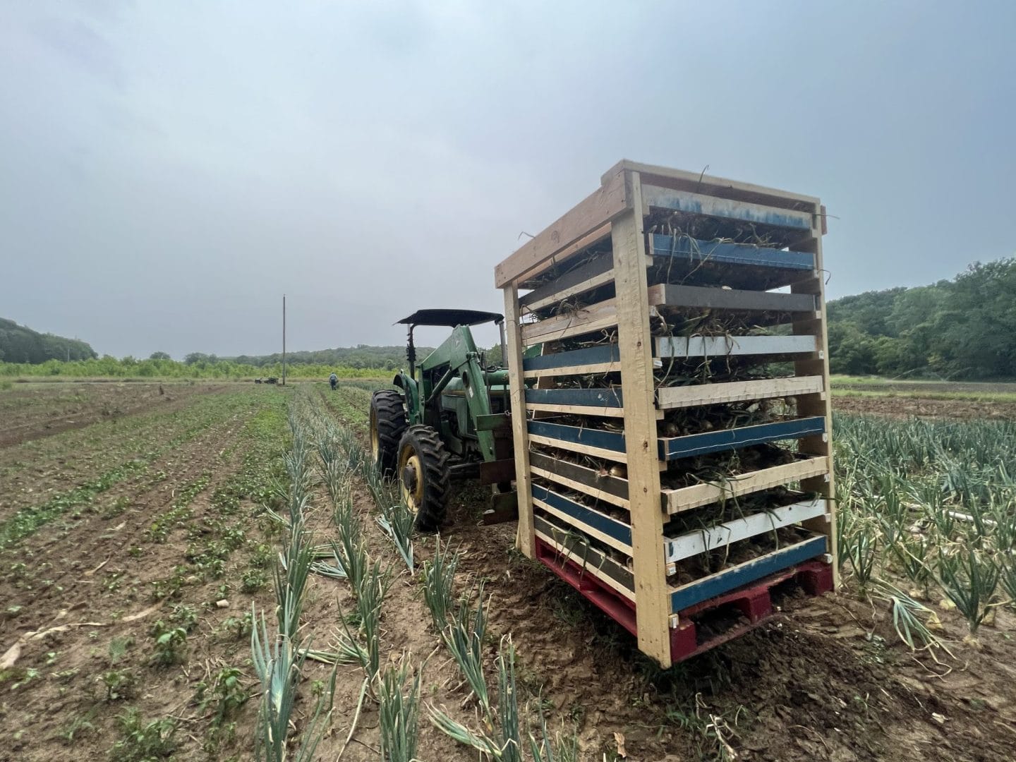 Traditionally, harvesting onions involves collecting them in bins and then transferring them to a drying location (typically laid out in a greenhouse with shade cloth and a single layer)—a process that typically requires handling the produce multiple times. Rachel’s drying rack reduces this to a single step: crops are harvested directly onto the shelves of the rack, where they remain for the next 2-4 weeks to dry. This innovation significantly cuts down on labor, time and risk of mishandling crops, making the post-harvest process more efficient, especially for a low value crop.